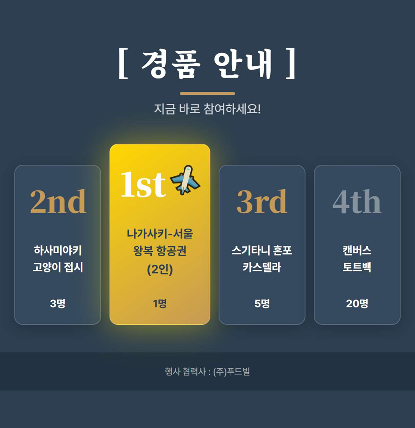맛이 있는 나가사키 메뉴(바사삭 아지후라이 세트, 탱글탱글 고토우동 세트, 청량가득 시마바라 소면 )중에 하나를 드리고 추첨 이벤트에 참여하실 수 있습니다.