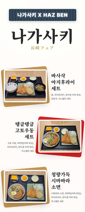 맛이 있는 나가사키 메뉴(바사삭 아지후라이 세트, 탱글탱글 고토우동 세트, 청량가득 시마바라 소면 )중에 하나를 드리고 추첨 이벤트에 참여하실 수 있습니다.